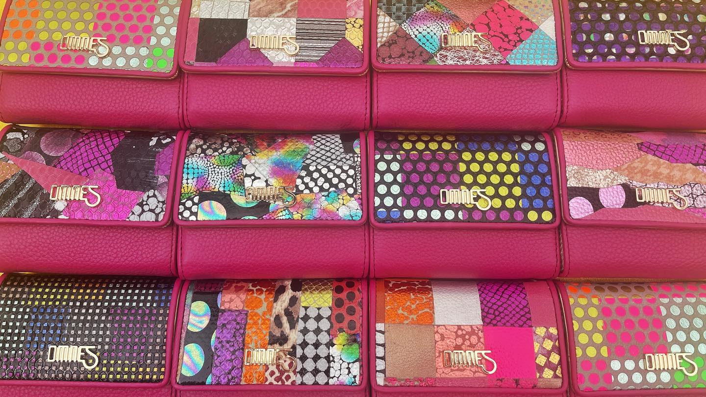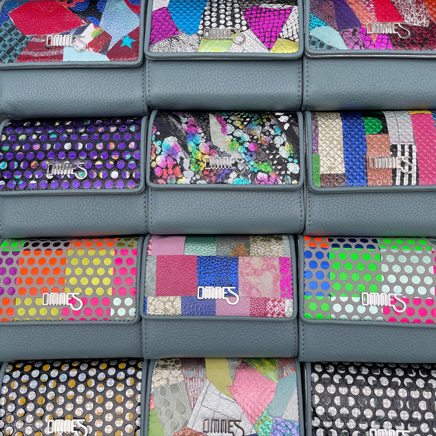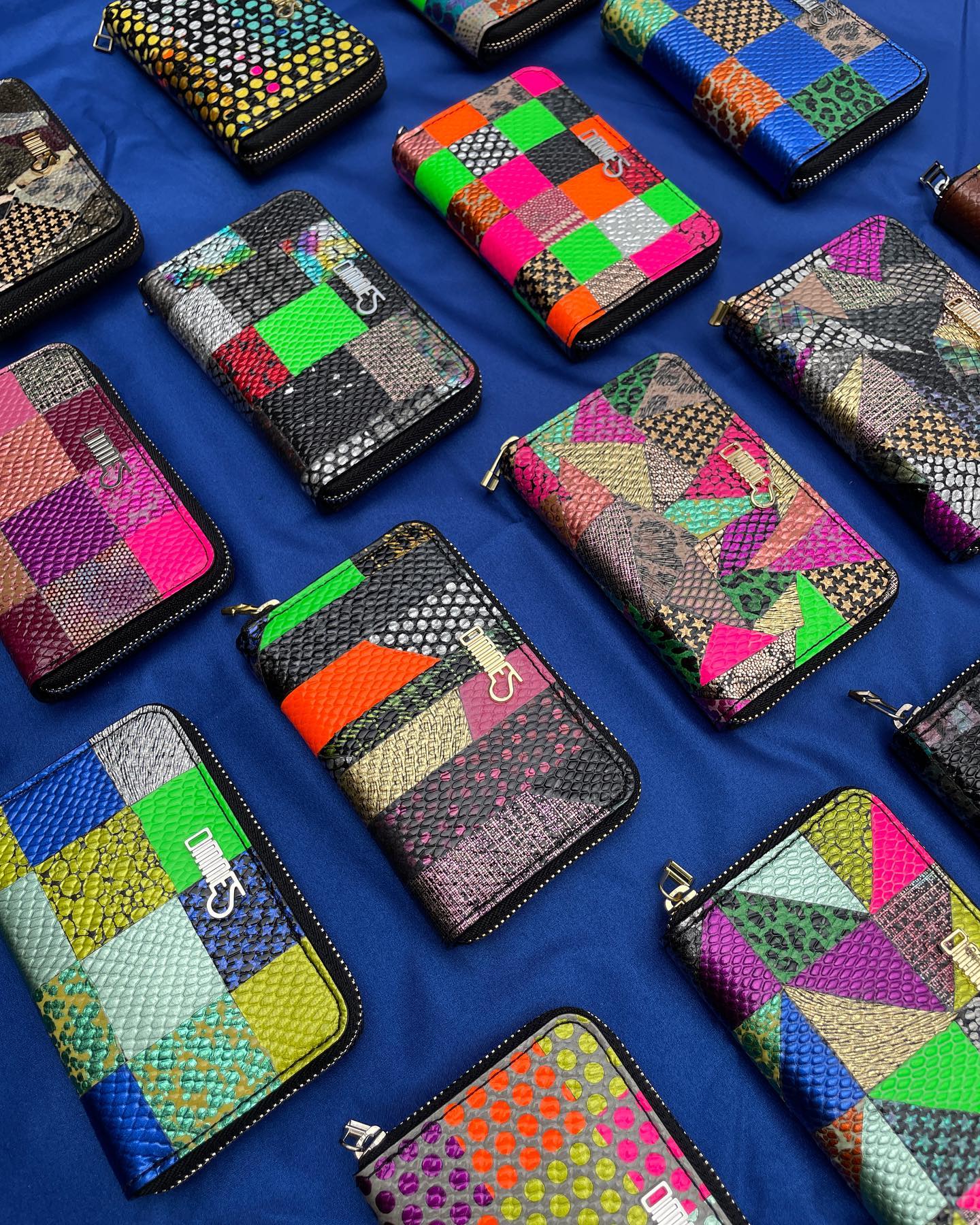 革の欠片を完成赴くままにひとつひとつ並べて作れるのは、1つの模様でA5サイズくらいの大きさで、そこからミニウォレットとキーケースを作るので本当に本当に世界に1つのアイテムです。